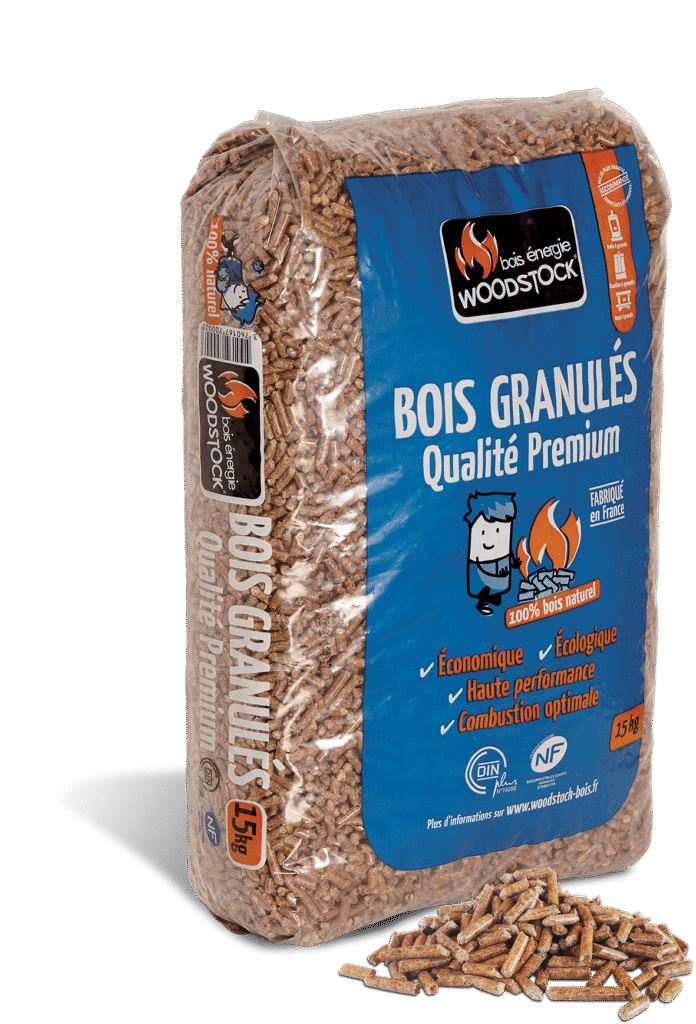 BOIS GRANULÉS WOODSTOCK – QUALITÉ PREMIUM – 64 SACS DE 15 KG.LA PALETTE À 225€